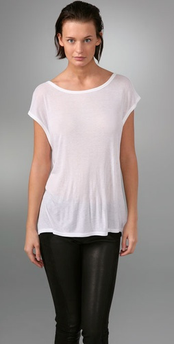 This jersey tee features a wide scoop neck and deep cowl back. Seam details at shoulders. Short dolman sleeves. Semi-sheer.* 26" long, measured from center back.* Fabrication: Jersey.* 100% tencel.* Hand wash or dry clean.